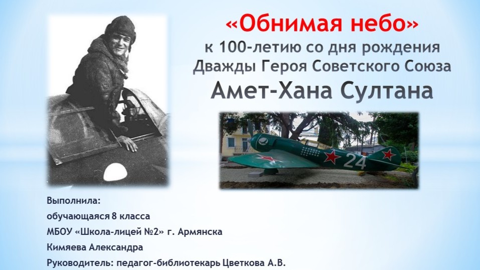 СПРАВКА. Легендарный летчик-испытатель Амет-Хан Султан родился 25 октября 1920 года в Алупке в семье рабочего. Выпускник 1-й Качинской военной авиационной школы в годы Великой Отечественной войны прошел путь от летчика до командира эскадрильи 9-го гвардейского истребительного авиационного полка. 31 мая 1942 года совершил под Ярославлем свой первый воздушный таран немецкого бомбардировщика «Юнкерс-88». Участвовал в Сталинградской битве, в ходе которой зарекомендовал себя как признанный ас. Последний свой воздушный бой провел 29 апреля 1945 года над находящимся в черте Берлина аэродромом «Темпельхоф», сбив «Фокке-Вульф 190» (30-я воздушная победа).
